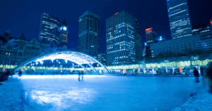 À Toronto, l’ambiance des Fêtes est électrisante. Le Toronto Christmas Market transforme le quartier historique de la Distillery en un véritable village de Noël , chalets de bois décorés, odeurs de cannelle et de chocolat chaud, chorales qui résonnent entre les briques rouges et la grande roue qui illumine le ciel hivernal. Plus loin, la ville scintille avec ses patinoires extérieures, comme celle emblématique de Nathan Phillips Square, dominée par le fameux panneau TORONTO.
